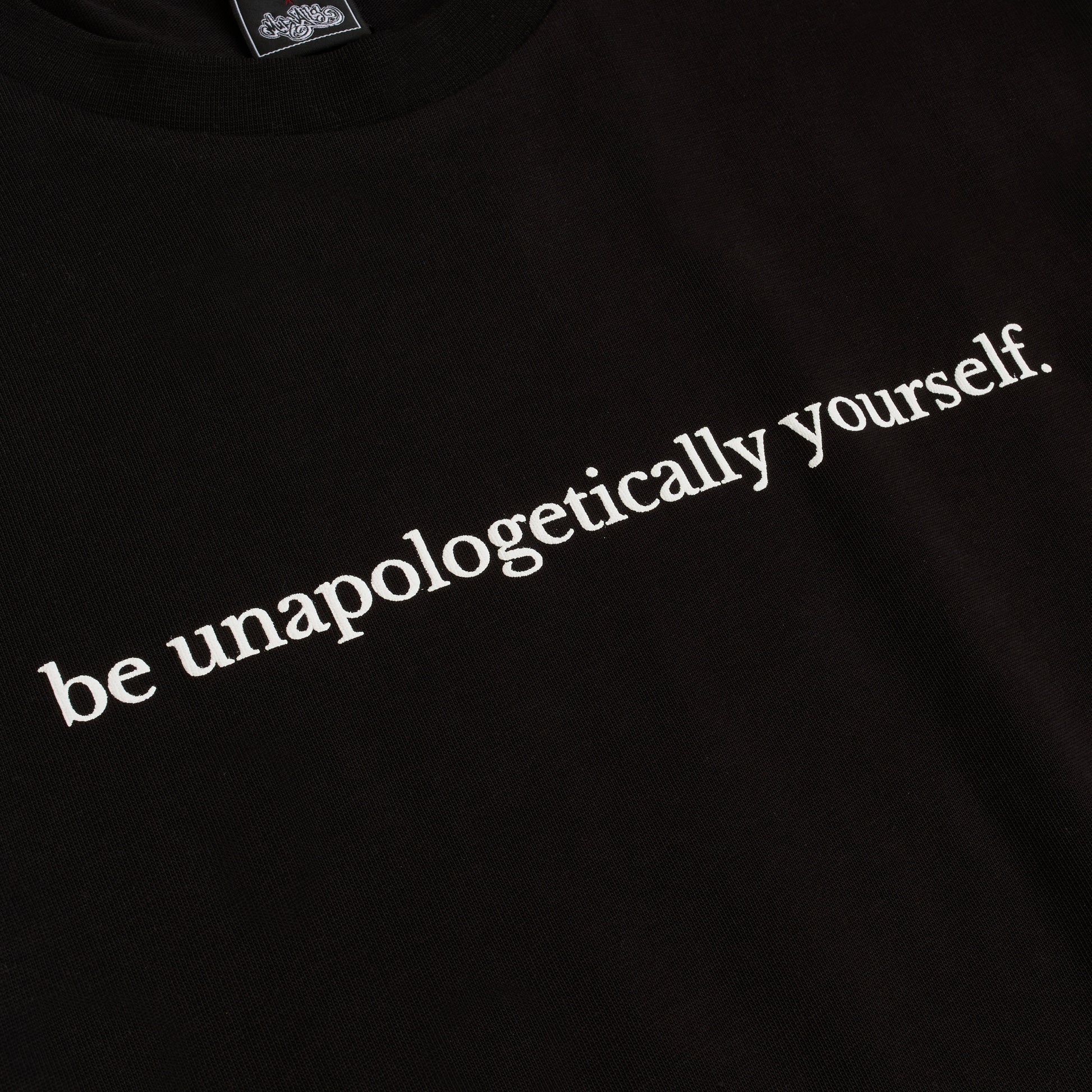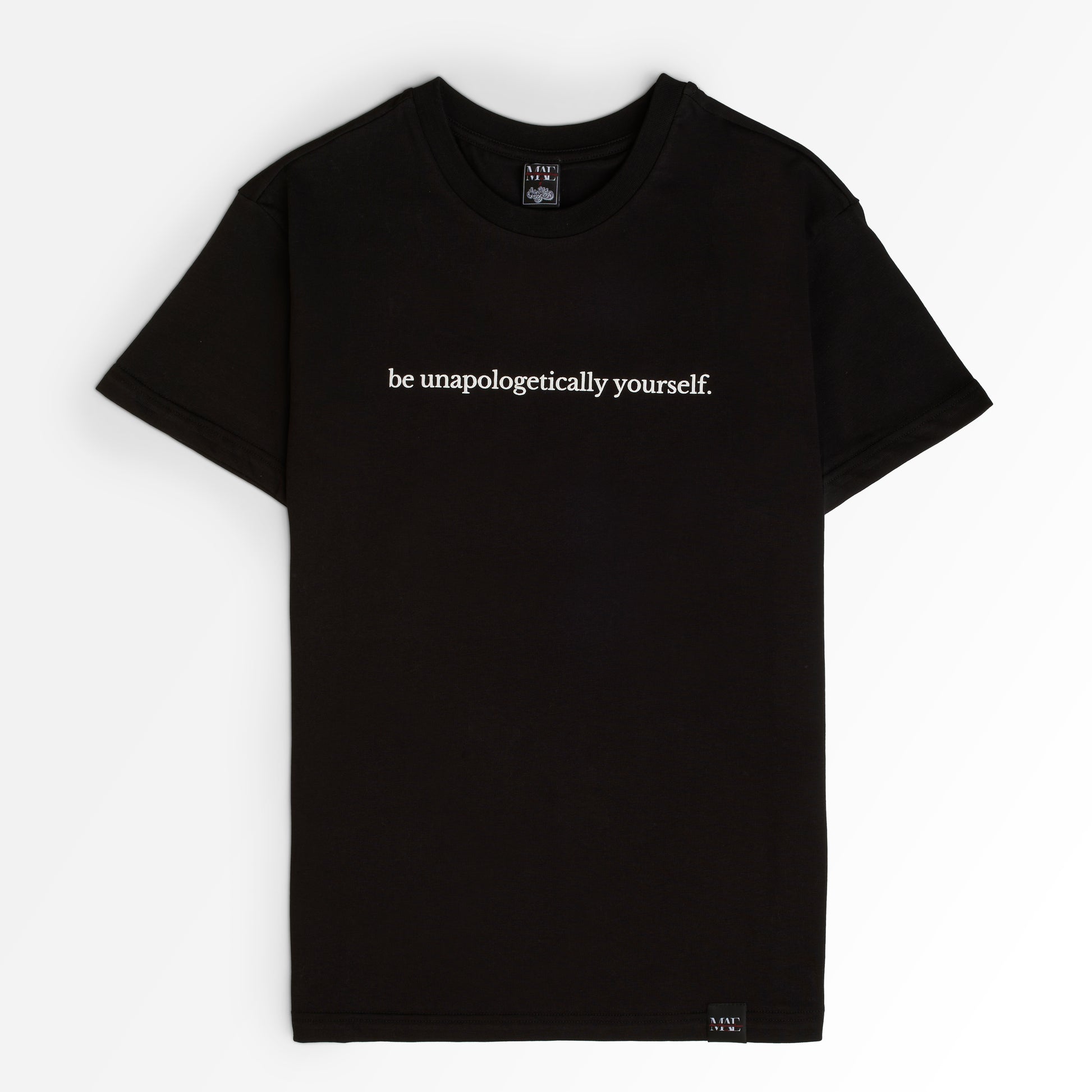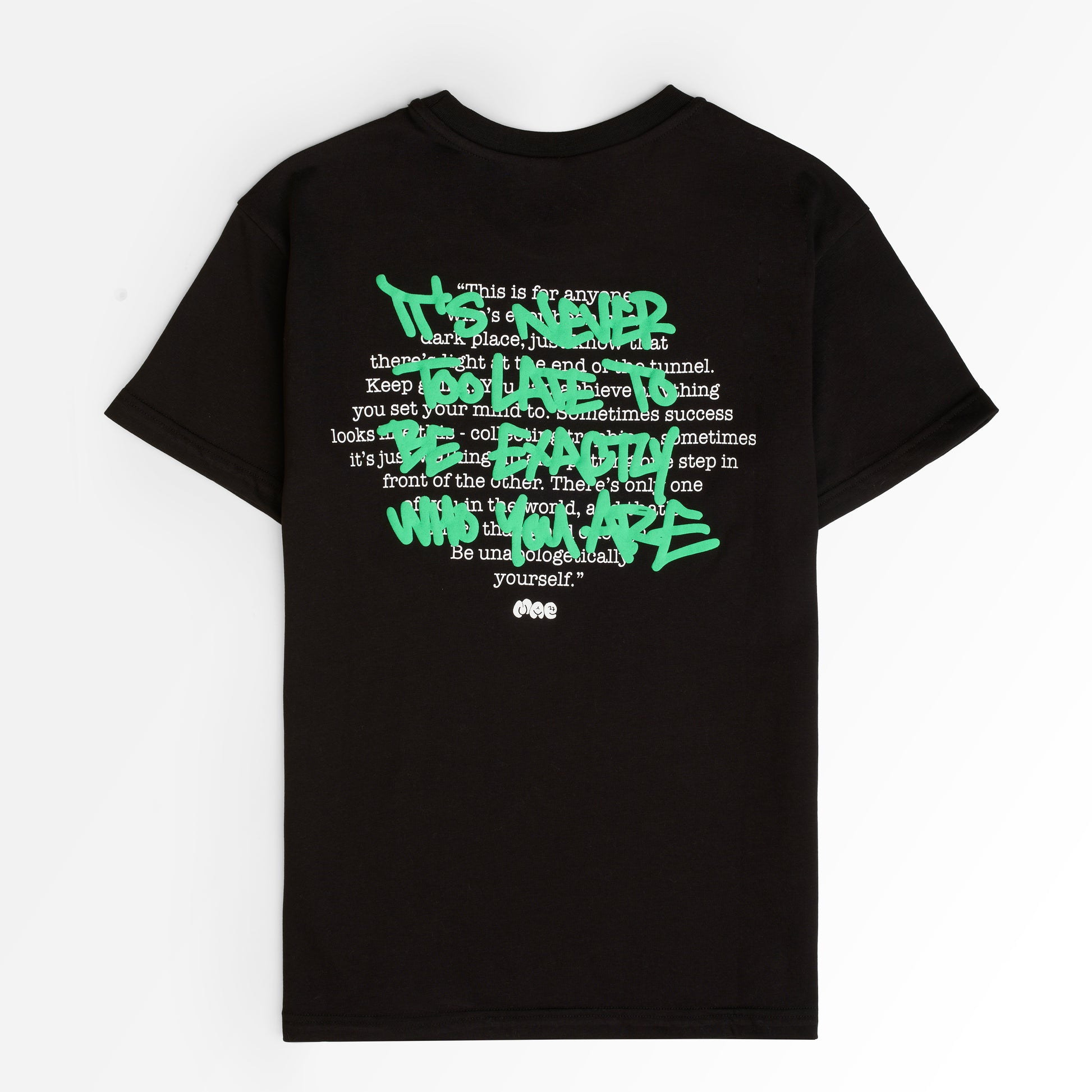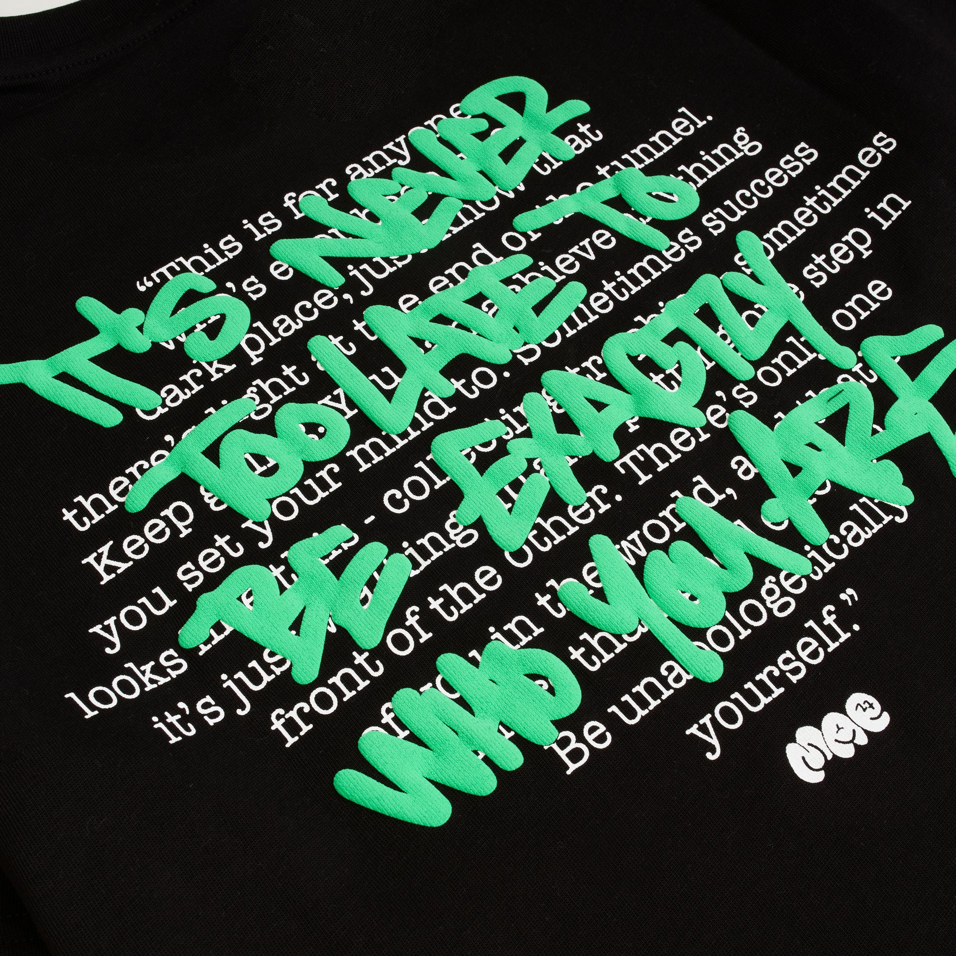 Introducing a twist on the original 'be unapologetically yourself.' tee. With 'be unapologetically yourself.' on the front of the tee- a reminder to lead with confidence. The back features a striking green puff graffiti overlay showcasing the words 'It's never too late to be exactly who you are' splashed across the full transcript of Mary's FIFA Best Awards 2022 speech.