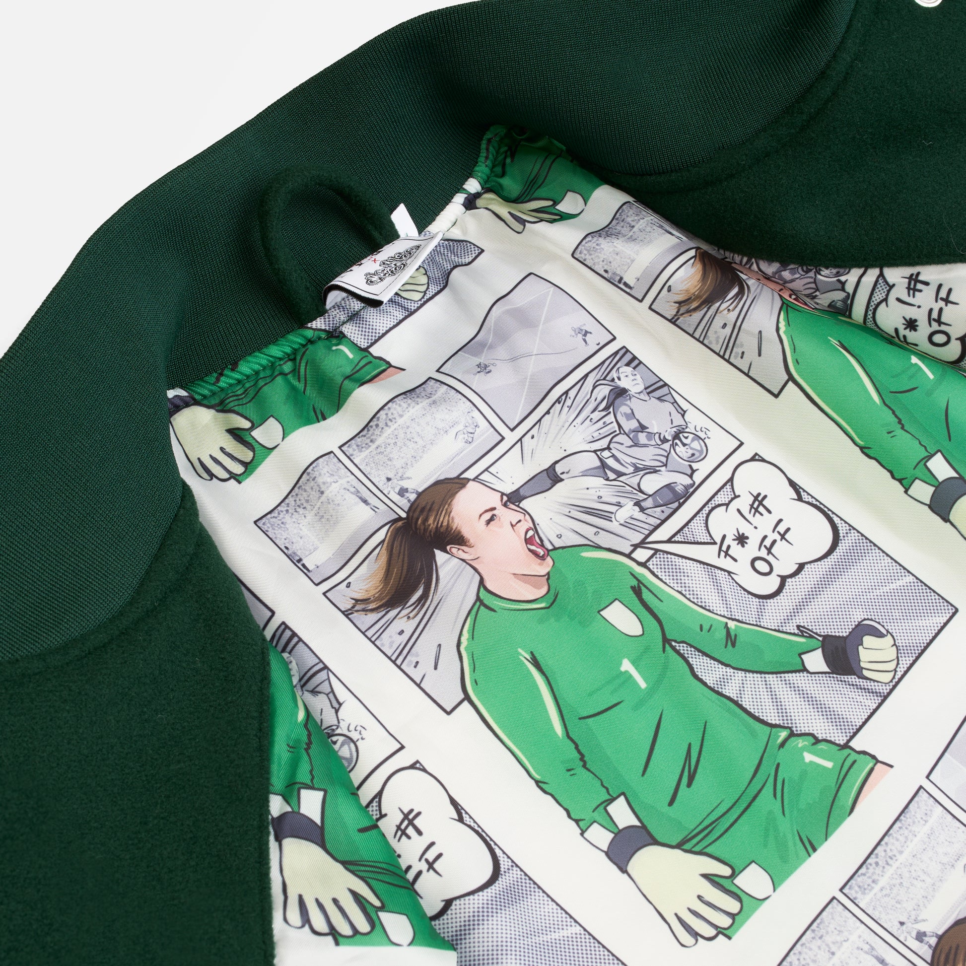 The stand out is the inside of the jacket- a luxurious silk lining reveals the unforgettable comic style sequence of Mary’s World Cup Final penalty save- hidden on the inside, but always with you.